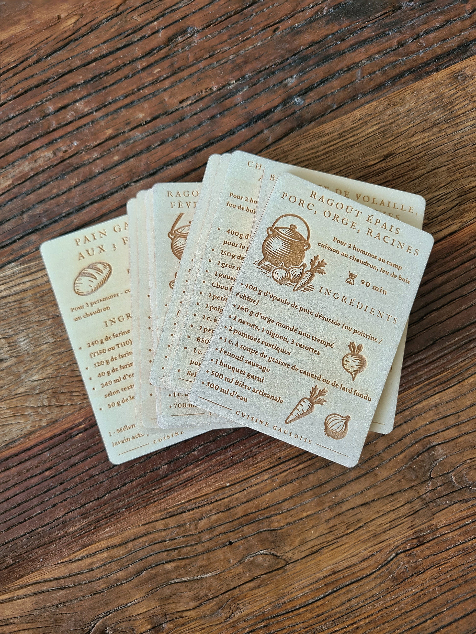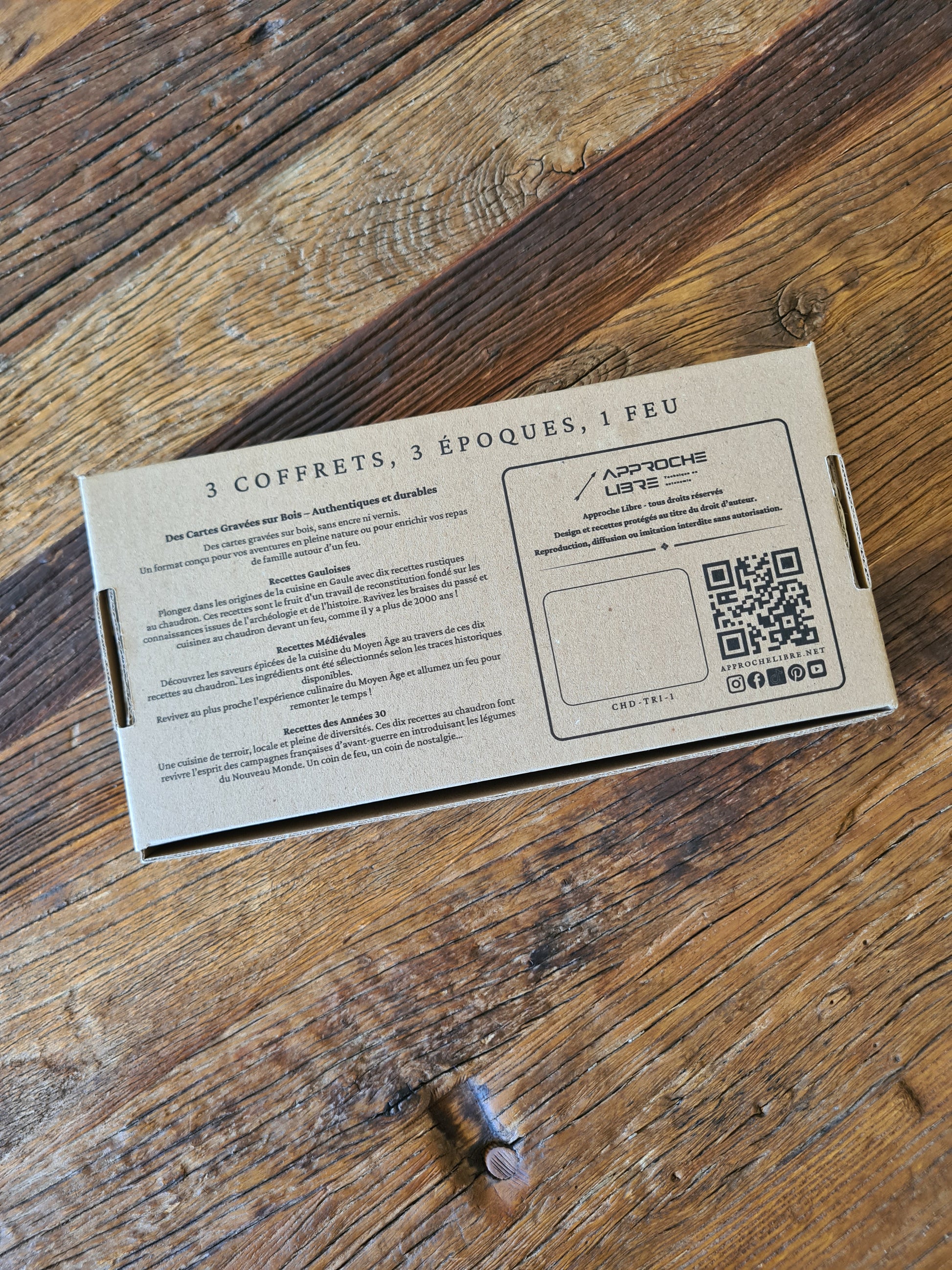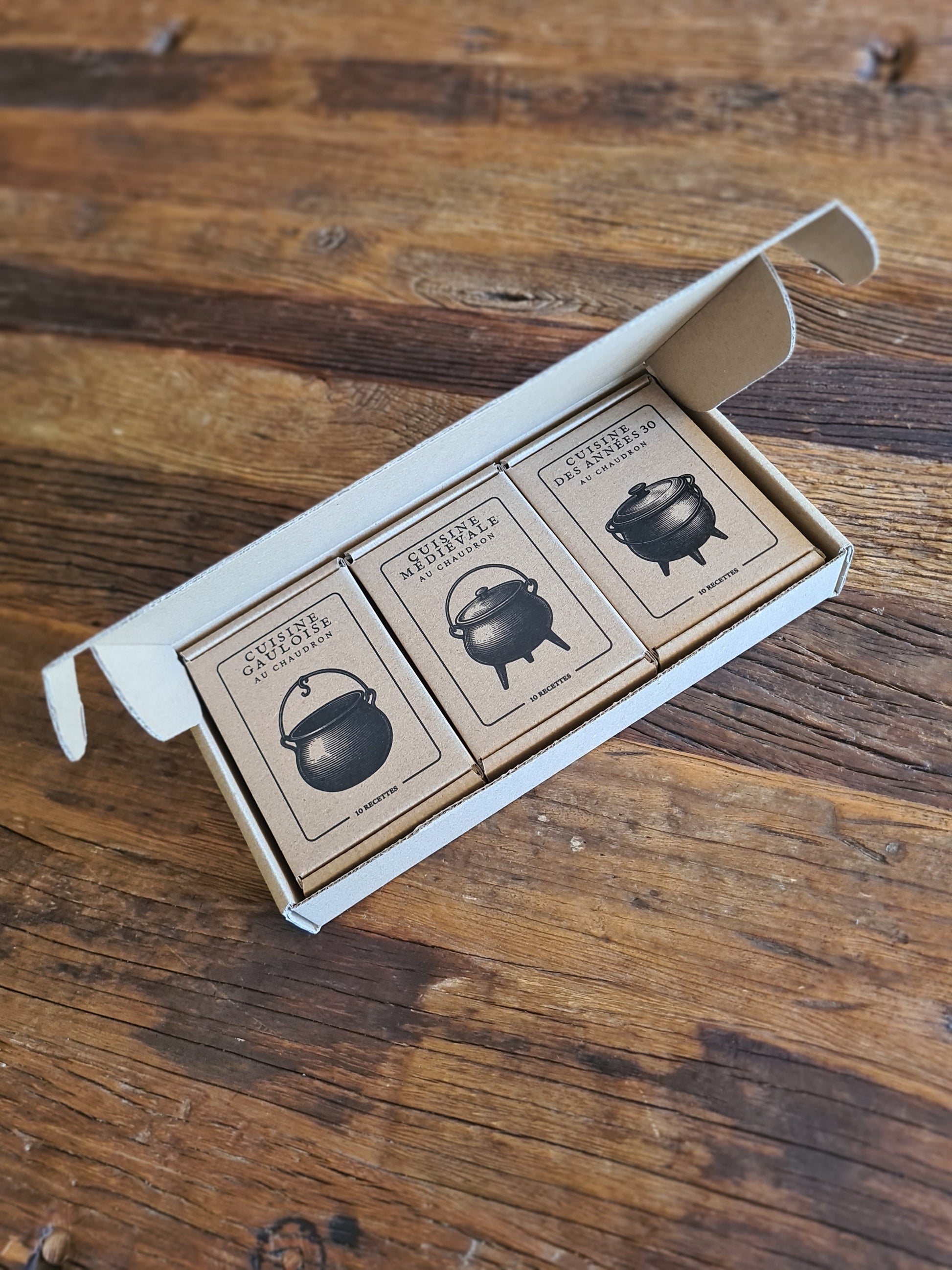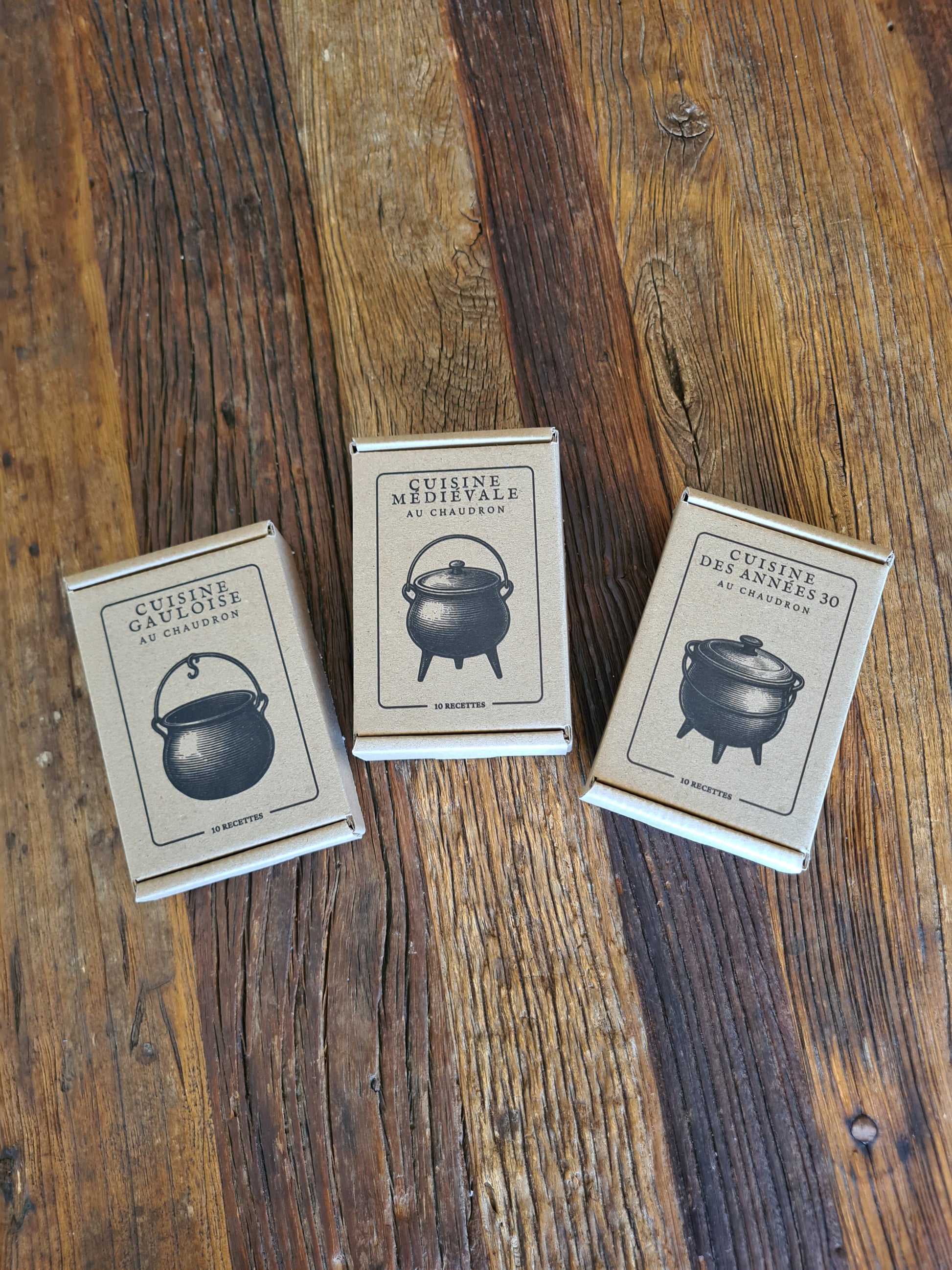 Nous avons créé trois coffrets uniques pour découvrir la diversité de la cuisine au chaudron : Cuisine Gauloise, Cuisine Médiévale et Cuisine des campagnes françaises des années 30.