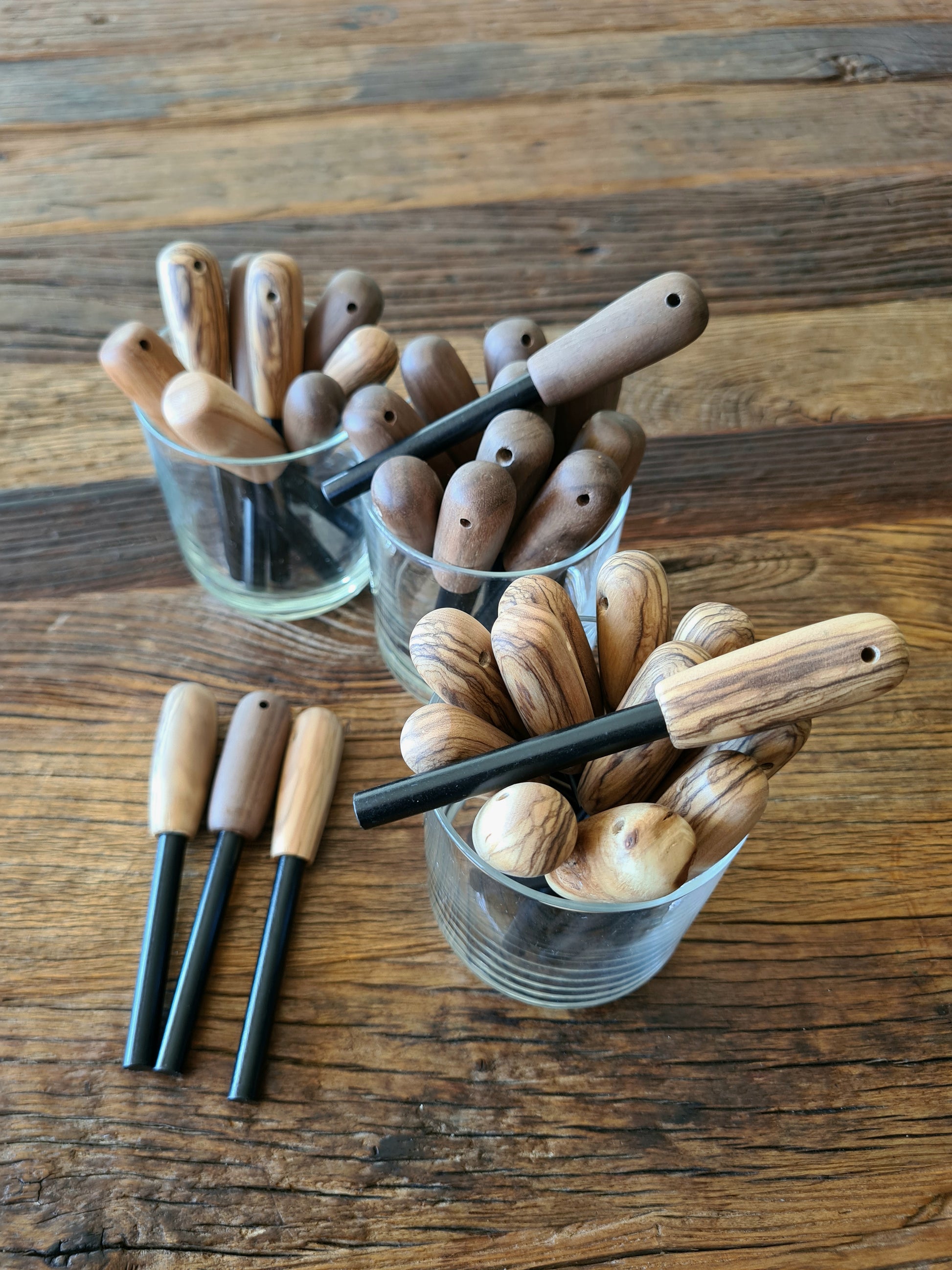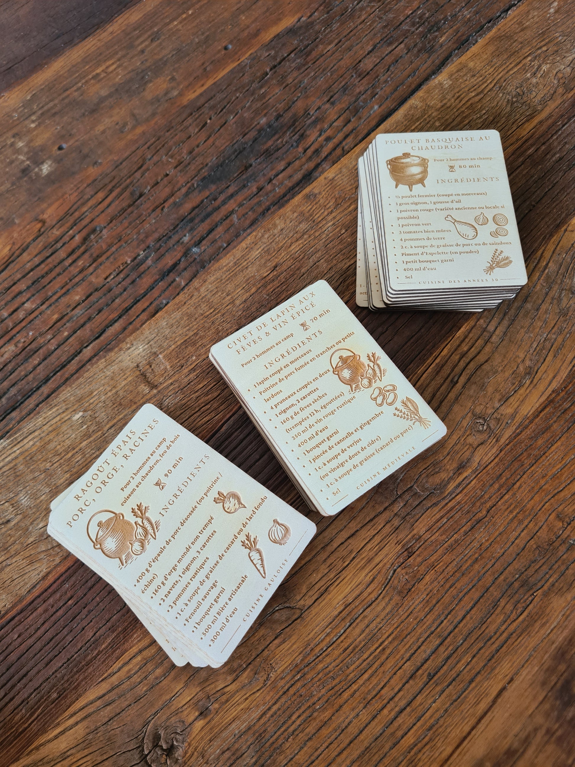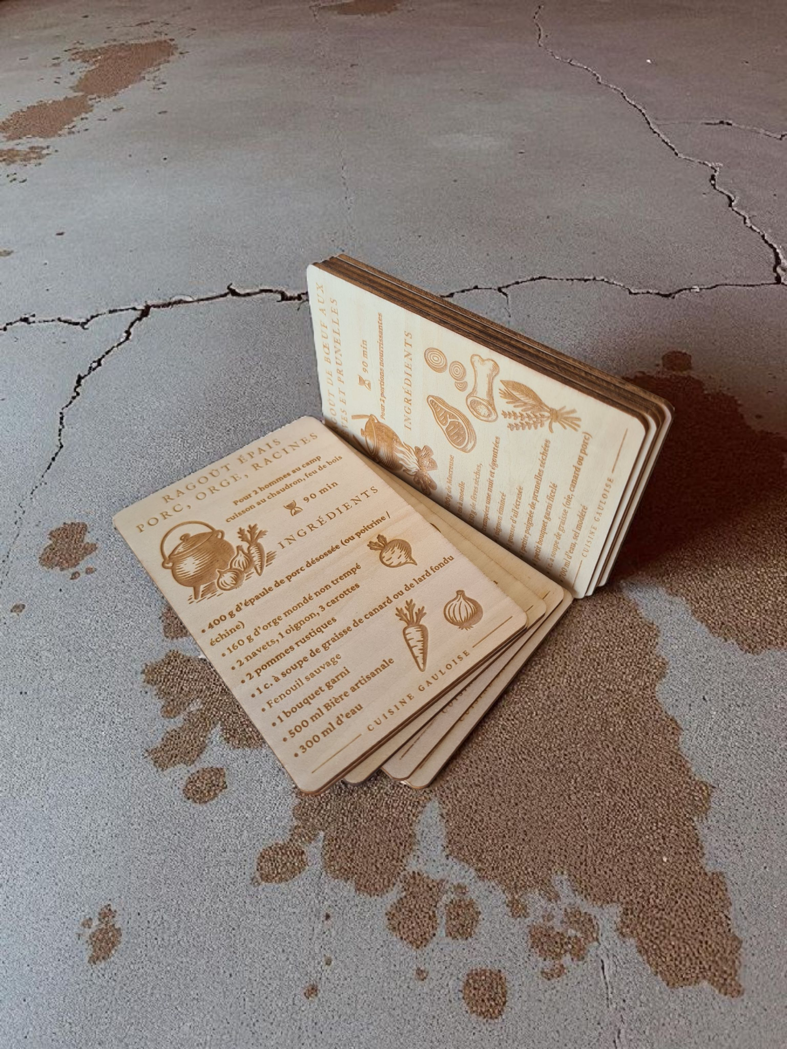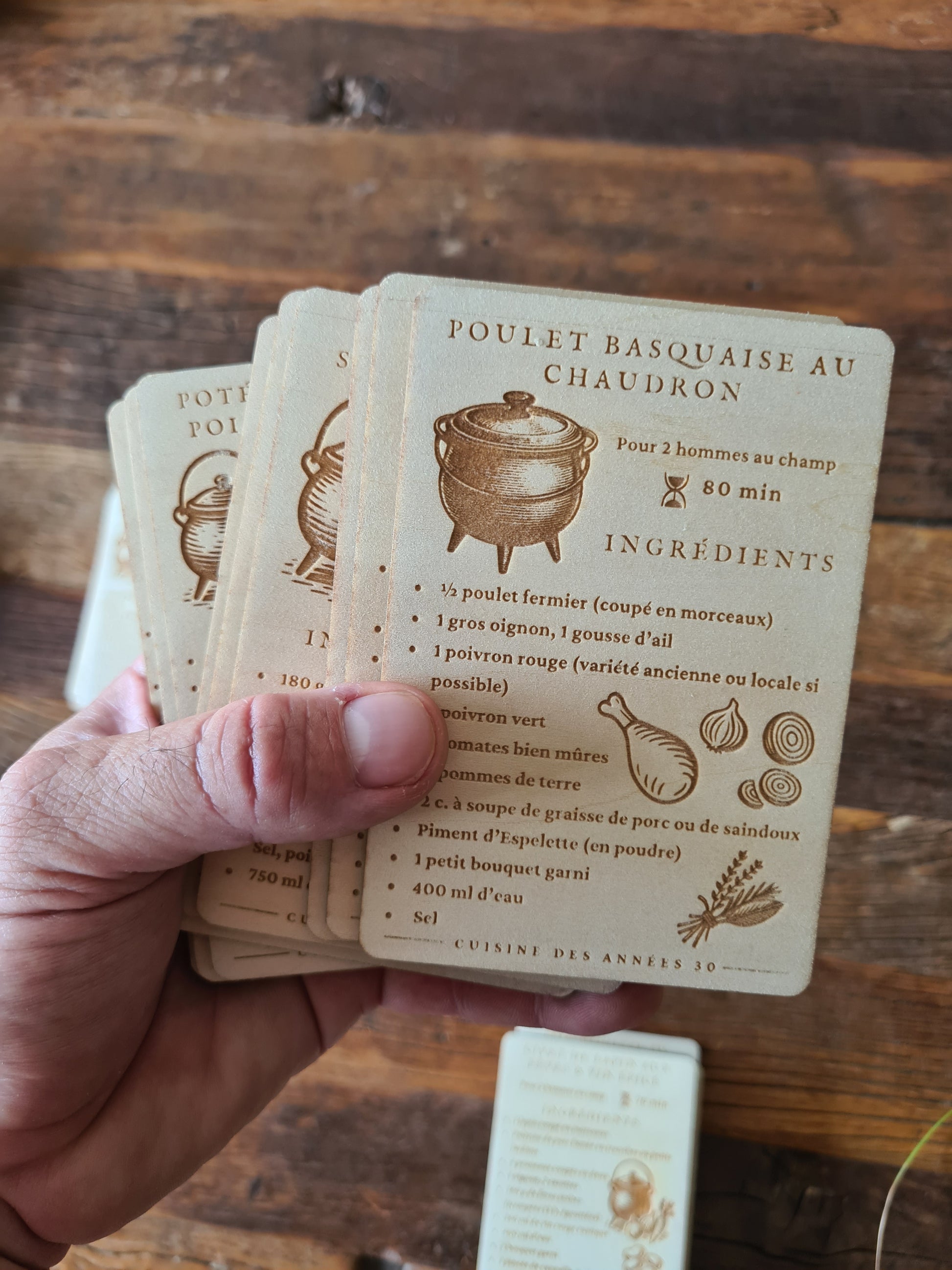 Nous proposons des coffrets de recettes gravées sur bois à réaliser au chaudron et du matériel pour la cuisine outdoor.